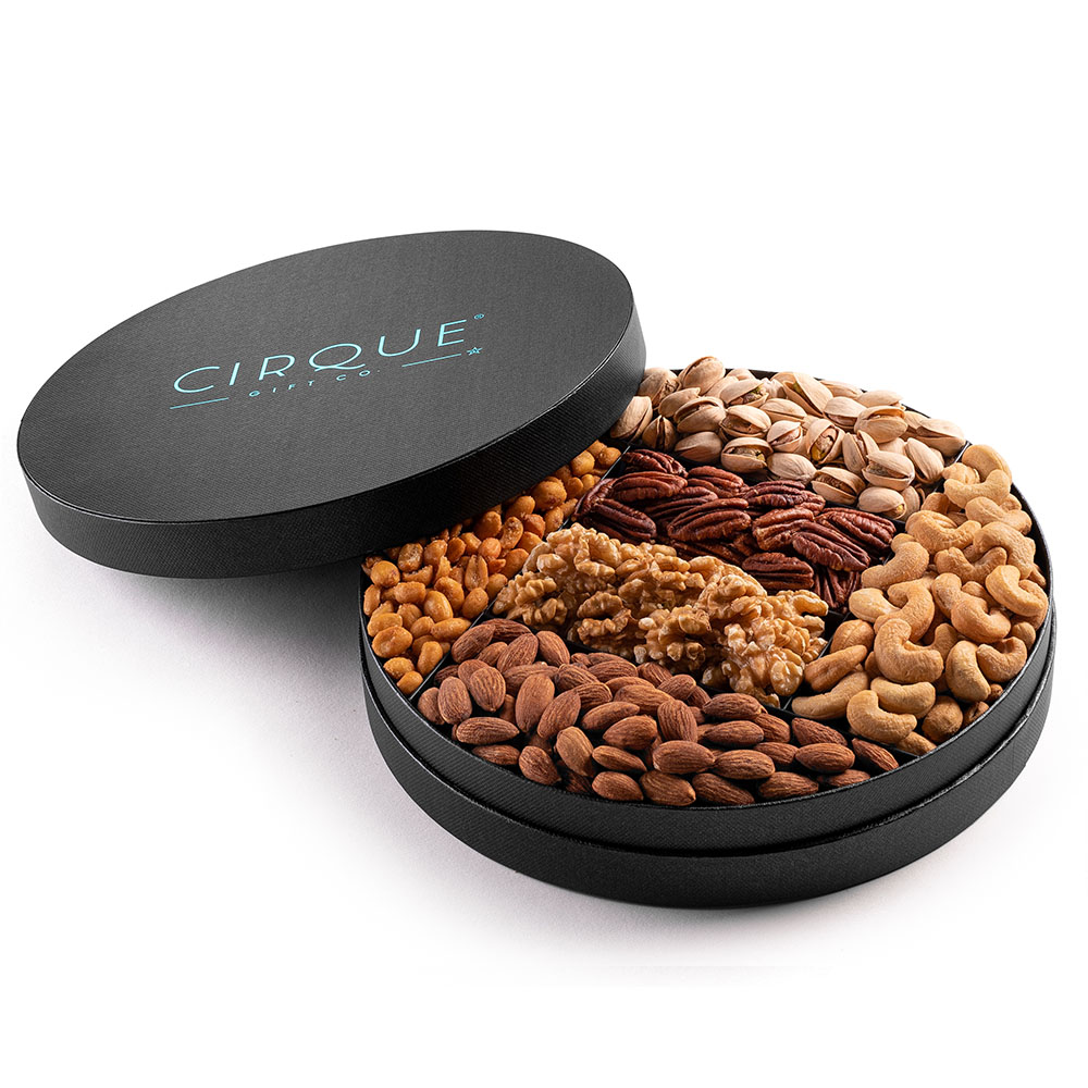 10″ Gourmet Nut Gift Tray. Includes Honey Roasted Peanuts, Almonds, Cashews, Pistachios, Pecans and Walnuts.