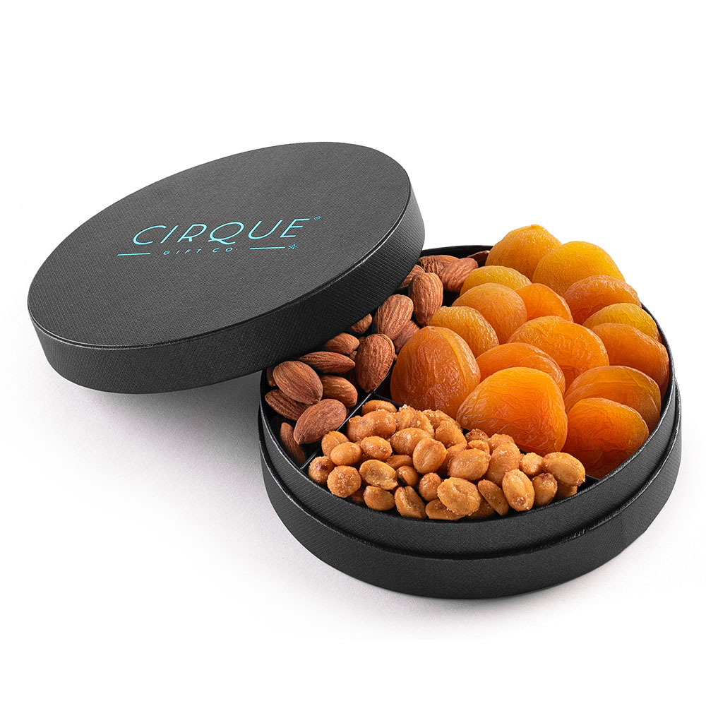 6″ Gourmet Nut and Dried Fruit Gift Tray. Includes Honey Roasted Peanuts, Almonds and Dried Turkish Apricots.