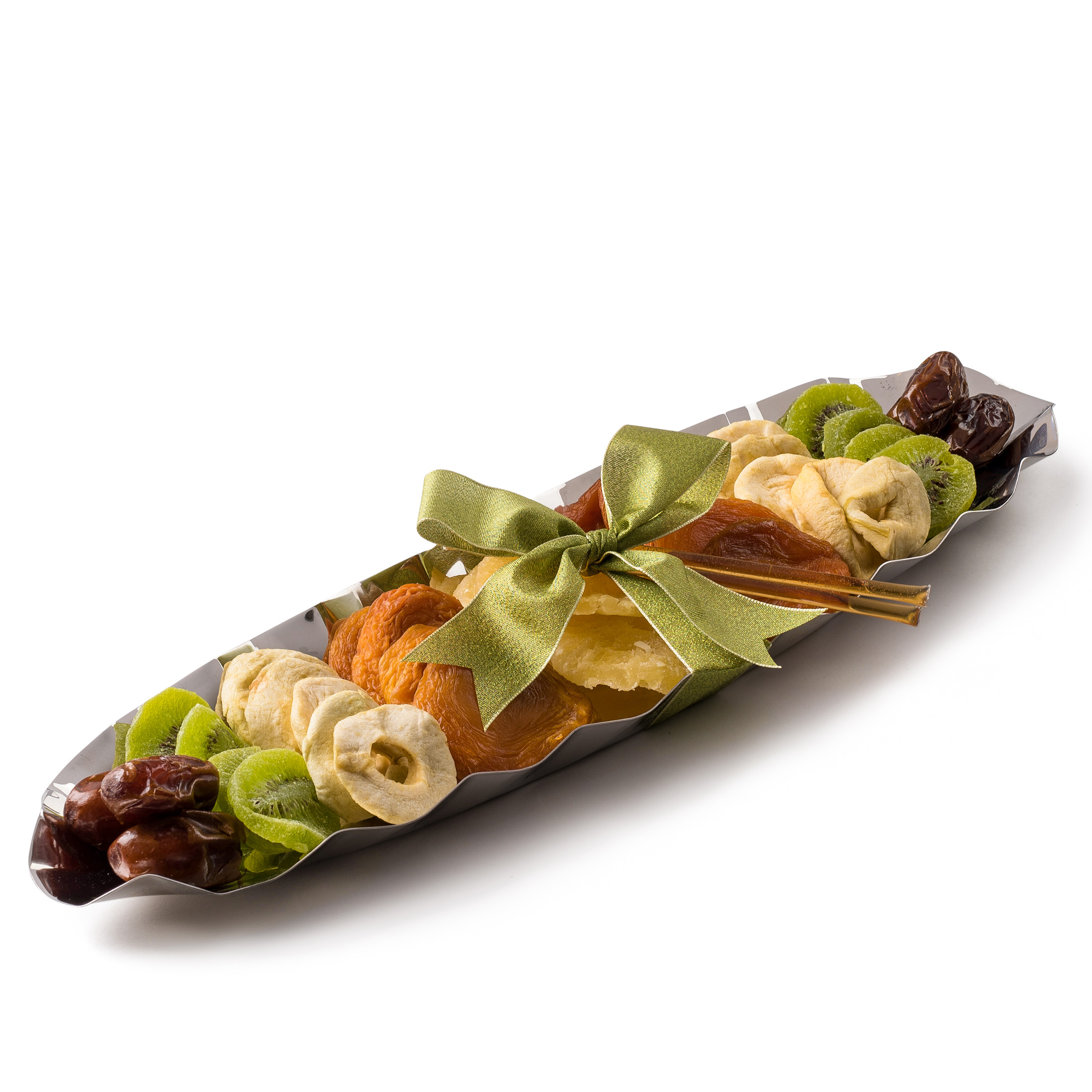 An elegant 19″ silver tray displaying dried fruit topped with honey sticks. This will surely be a crowd pleaser!