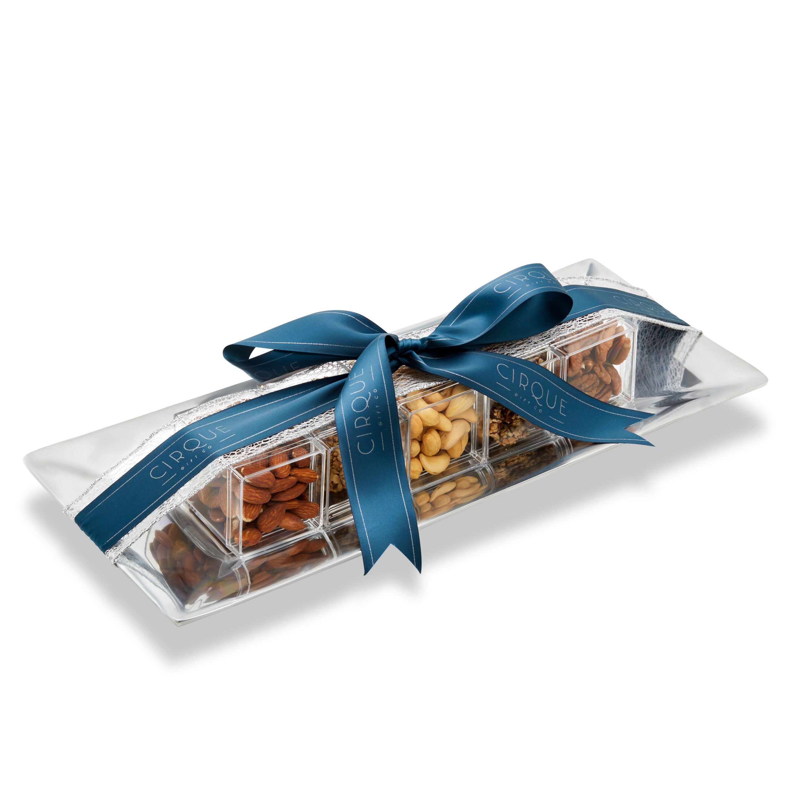 This stunning over sized tray comes filled with assorted nuts and chocolates for that perfect presentation.